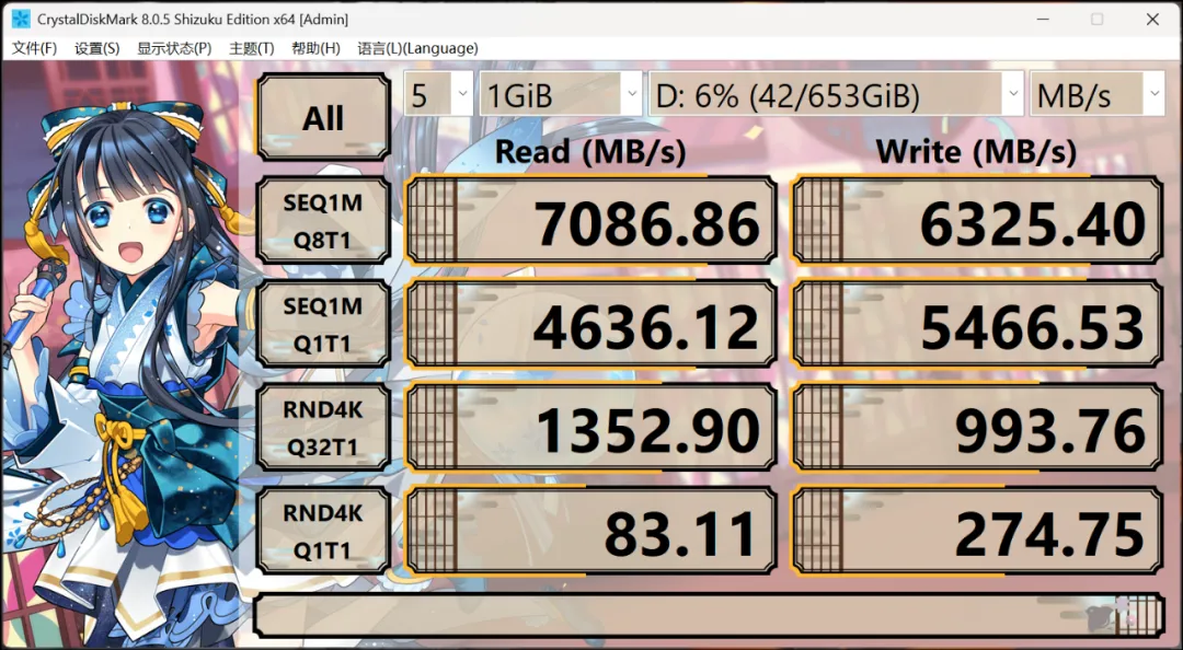 标配的2条16GB DDR5-5600内存来自镁光,实测性能如图所示。硬盘则来自长江存储PC411,实测读写速度如图所示,属于性能级PCIe 4.0 SSD,无线网卡为支持Wi-Fi 6E的英特尔AX211。