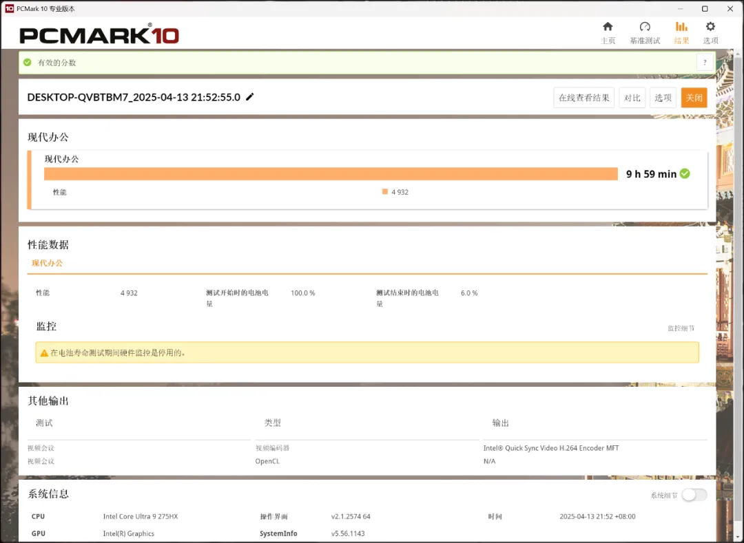 主板的下方,则是天花板级容量的99Wh电池,在核显模式+节能模式,30%屏幕亮度,打开Wi-Fi关闭蓝牙的状态下,运行PCMark10的现代办公续航测试可以取得接近10小时的续航成绩。可见这一代的酷睿Ultra 200HX处理器和RTX50独显的能效都有了明显改善,续航已媲美甚至超越过去搭载H45平台处理器的老将了。