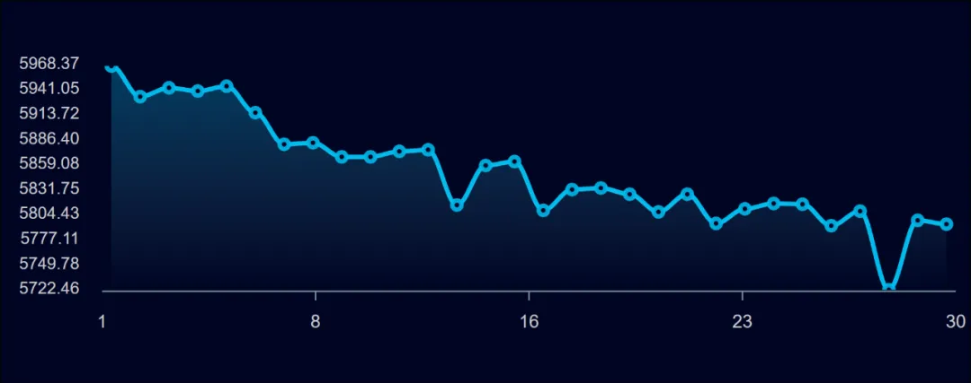 在30轮CineBench R15测试中,基本为一个下行的曲线,最高5968,最低5722,分数差值最高4.2%,可见耀世16 Ultra在短时间的峰值多核性能会非常夸张。