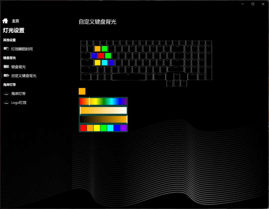 键盘右上角还是熟悉的电源开关和快捷键,能在自定义、办公、均衡和狂暴模式之间切换。