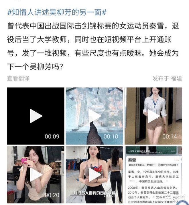 事实上,除了吴柳芳,退役后在网上当主播的运动员并不少见,同样有擦边嫌疑的也不是只有吴柳芳一人。这不,前中国击剑队优秀运动员,曾获得过亚洲冠军的秦雪,就在近日被部分网友质疑,所发的视频有擦边的嫌疑。而身为百万粉丝主播的秦雪则表示,自己并不想红,只不过想赚点钱。