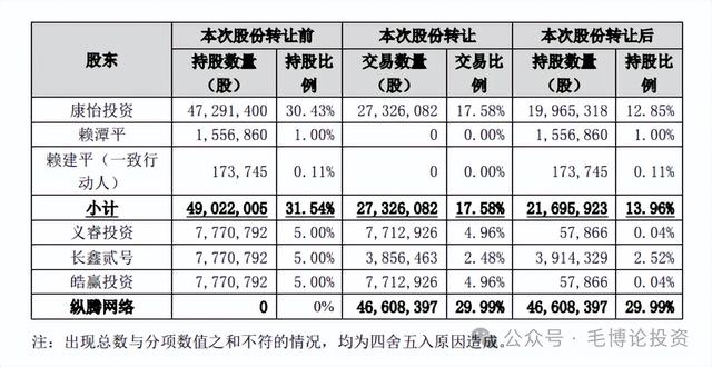 2025年4月26日福建上市公司绿康生化(002868)发布了《关于筹划重大资产出售暨关联交易的提示性公告》,绿康生化四大股东上海康怡投资、杭州义睿投资、上饶长鑫贰号及杭州皓赢投资于2025年4月24日与纵腾网络签署《股份转让协议》,以每股13.73元的价格协议转让46,608,397股普通股,转让款合计6.4亿元。交易完成后,纵腾网络持股比例将跃升至29.99%,超越原控股股东康怡投资12.85%的持股比例,公司实际控制人由赖潭平变更为纵腾网络创始人王钻。