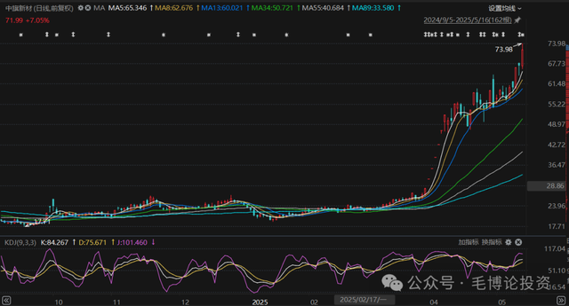 2025年3月31日,中旗新材(001212.SZ)发布公告称,广东星空科技装备有限公司通过协议受让方式,以8.03亿元收购中旗新材24.97%股份,其一致行动人陈耀民同步购入5.01%股份,合计持股比例达29.98%。交易完成后,星空科技成为中旗新材控股股东,实控人由周军变更为半导体领域知名人物贺荣明。星空科技以精密机械、精密光电、精密运动、精密控制,以及复杂软件为核心技术,研制半导体、泛半导体、精密制造、新能源、生物医药等领域的创新装备。之后股价由29.27元连续涨至51.87元,5月16日股价71.99元,市值92.47亿。