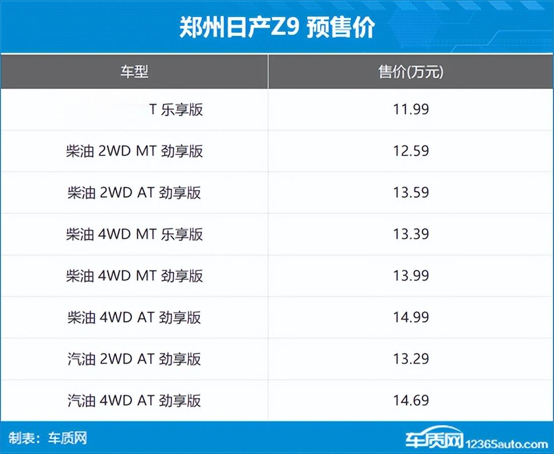 3月31日,郑州日产Z9开启预售,新车定位为皮卡车型。其中,Z9共推出8款配置车型,预售价格区间为11.99-14.99万元;Z9GT共推出6款配置车型,预售价格区间为15.69-18.19万元。此外,官方还推出了尊享5重礼,包括轻松购车礼、缤纷焕新礼、无忧用车礼等。