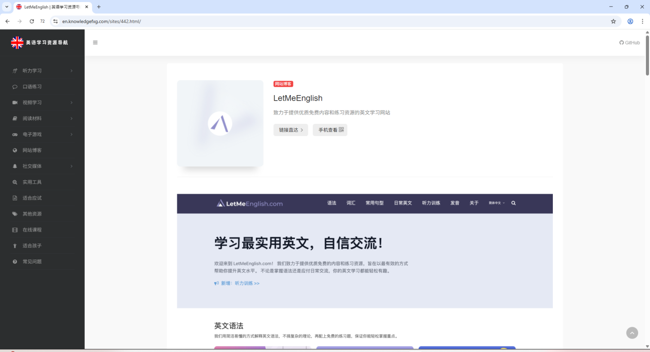 4、英语学习资源导航这是一个能帮你一站式搞定英语学习所有需求的网站导航。不论你是想提升口语练习听力,还是备考雅思托福,全都能在这里找到最优质的学习资源。这里还集合了剑桥英语、牛津英语ra等一线英语学习网站的资源,学习质量直接拉满,而且网站里还整合了各类实用工具,像在线词典、语法检查器学习和辅助工具,全都一站式解决