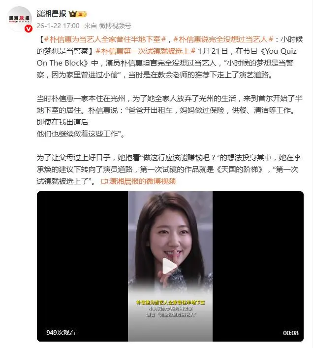 近日,朴信惠在综艺《You Quiz On The Block》中的坦诚自白,揭开了不为人知的过往——为圆她的艺人梦,全家从光州举家迁往首尔,挤在潮湿的半地下室度日,父母更是身兼数职,甚至靠打扫厕所赚钱维持生计。这段比韩剧更动人的逆袭故事,让全网读懂了她星光里的厚重底色。