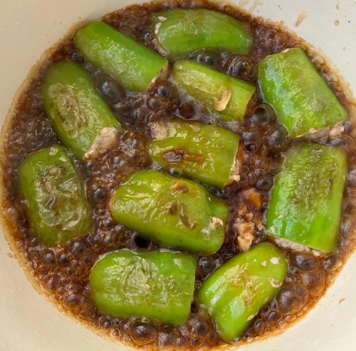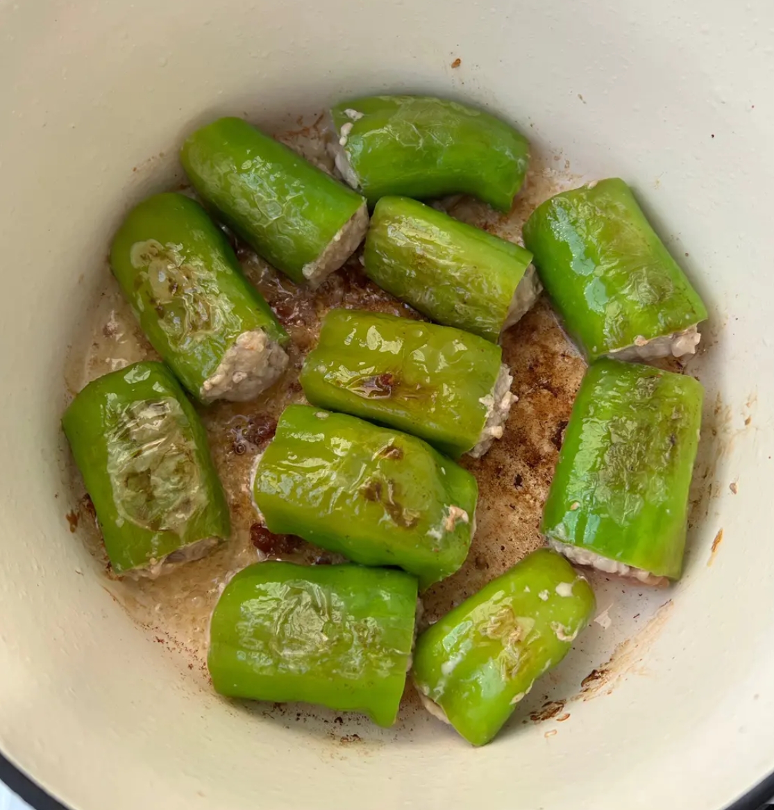 5. 焖煮入味: 将酱汁的所有调料混合均匀,倒入锅中,水量约为青椒高度的一半。盖上锅盖,转中小火焖煮5-8分钟,让青椒熟透,肉馅充分吸收酱汁的味道。