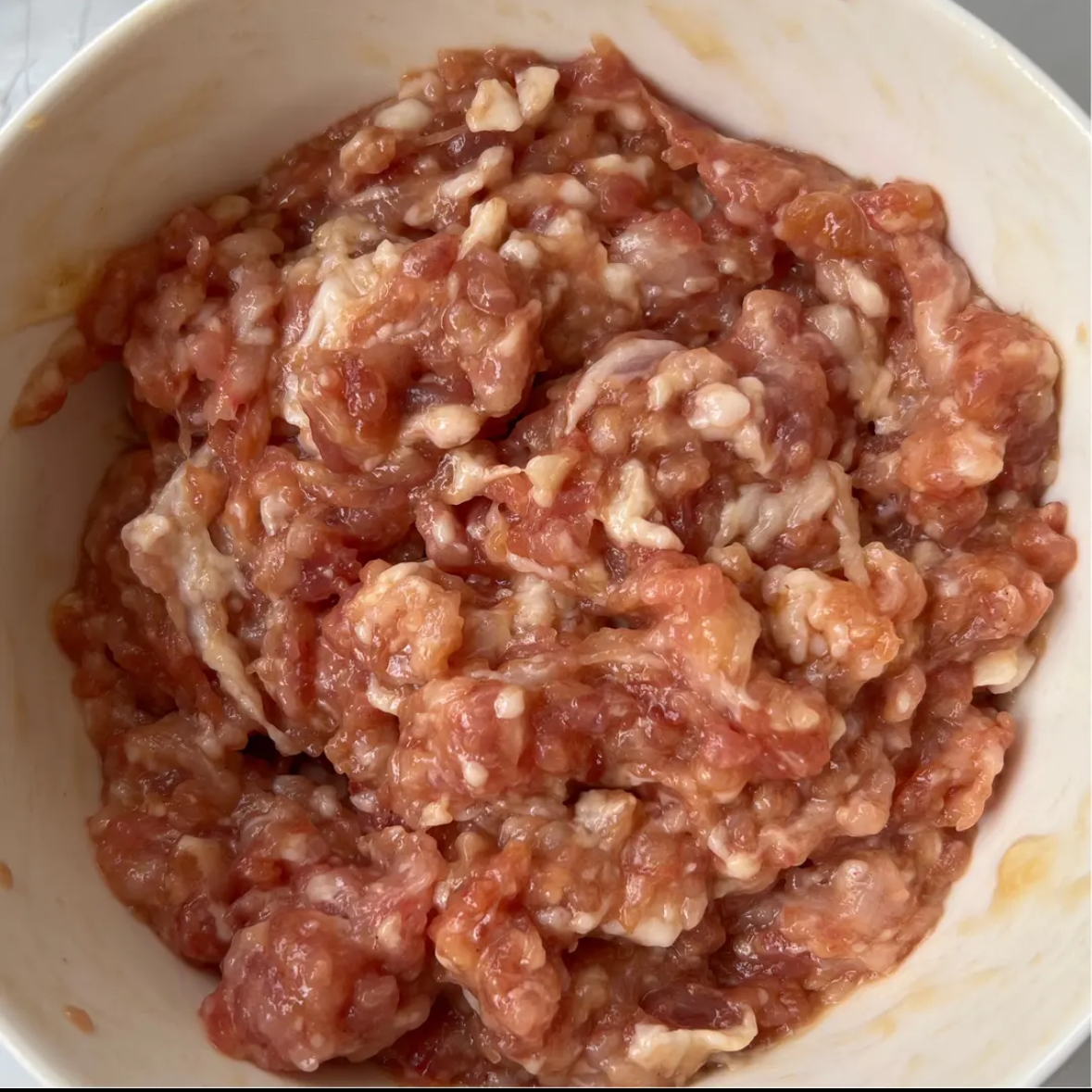 2. 调制肉馅: 将猪绞肉放入碗中,加入生抽、蚝油、白胡椒粉和淀粉,打入一个鸡蛋。顺着一个方向快速搅拌,直至肉馅上劲,变得粘稠有弹性。