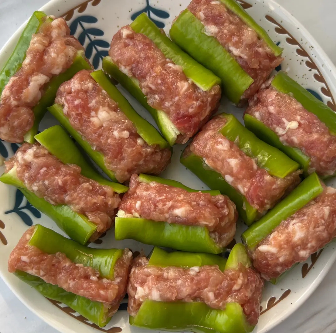 3. 酿肉: 将调好的肉馅填入青椒筒内,用手轻轻压实,使肉馅与青椒贴合紧密,两端可稍微抹平。