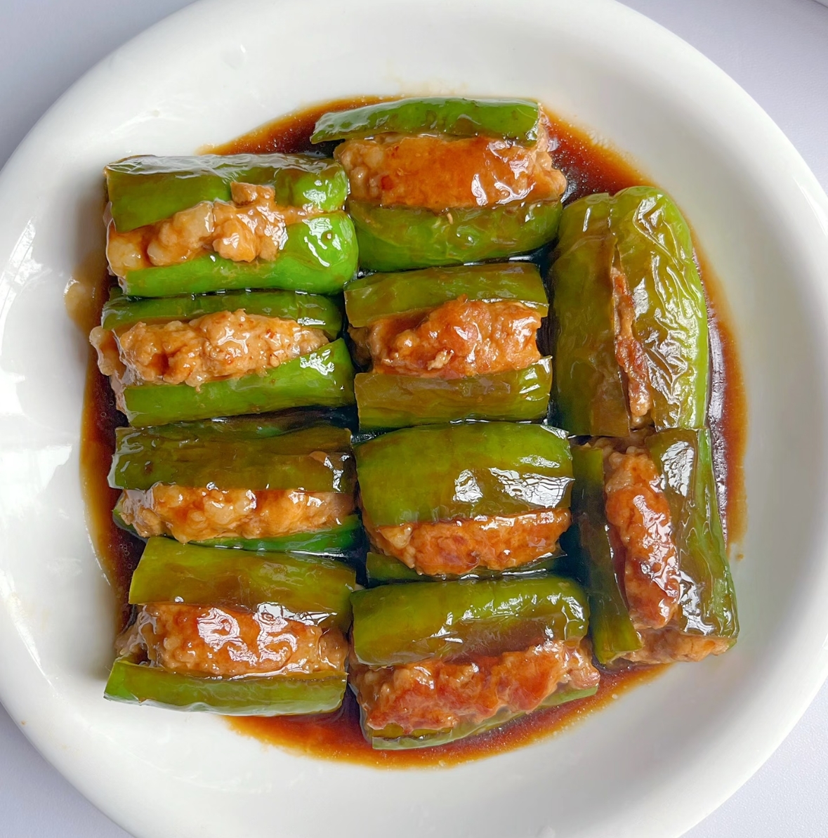 6. 收汁: 打开锅盖,转大火,淋入少许水淀粉勾芡,使汤汁变得浓稠,然后均匀地淋在青椒酿肉上即可出锅装盘。