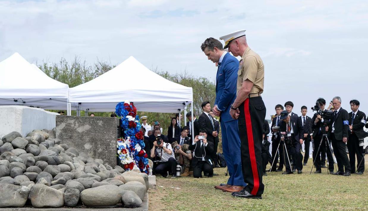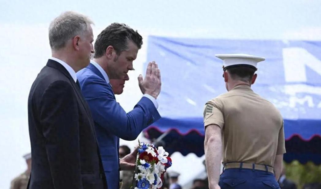 赫格塞思开始了他第一次访问日本,当天就到了硫磺岛,还参加了纪念美日战死士兵的活动。在这时候,这位美国国防部长说了这么一段话。