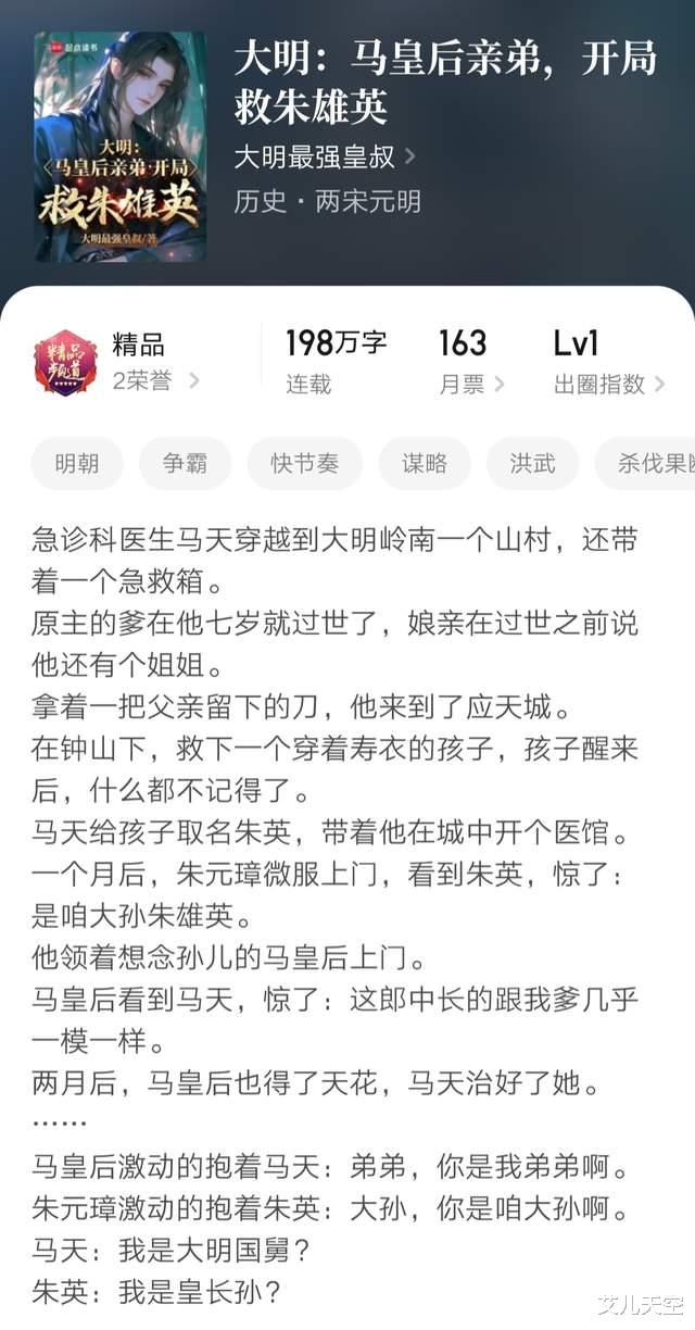 主角身边还带着个专业的急诊箱,准备去京城讨生活,路上在河里救了不知何故在水里飘着的刚过世的八岁朱雄英,由此开始了这个大明故事。主角的设定看着还是马皇后同父异母的弟弟,五千均左右。
