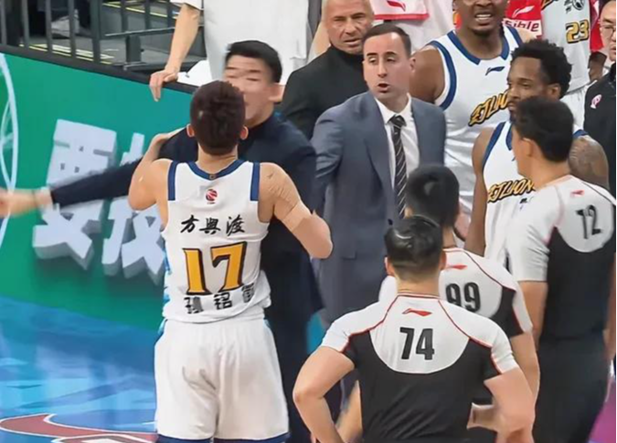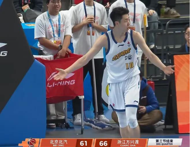 紧接着,广厦男篮进行了人员的轮转轮,人员轮转之后,广厦男篮又取得了5分的领先。在第三节最后时刻,周琦上篮命中。时间还剩5秒钟,球落地之后,表并没有停止计时,朱俊龙想拿球发球,然而球在周琦的脚下,朱俊龙摸不到球。直到时间走完,裁判并没有对这个行为进行吹罚,王博教练跳起来和裁判理论,最终领到技术犯规。