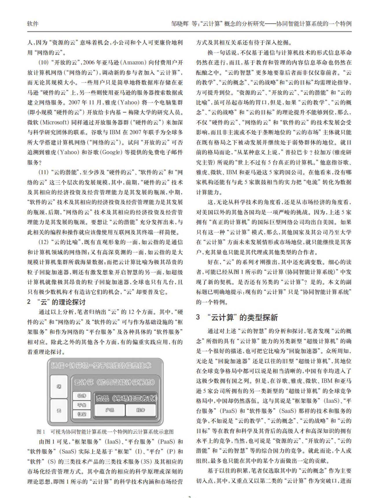 云计算的技术体系:文章对云计算的技术体系进行了详细阐述,包括基础设施服务(IaaS)、平台服务(PaaS)和软件服务(SaaS)等三个层次的技术服务。同时,文章还探讨了云计算与协同智能计算系统之间的关系。