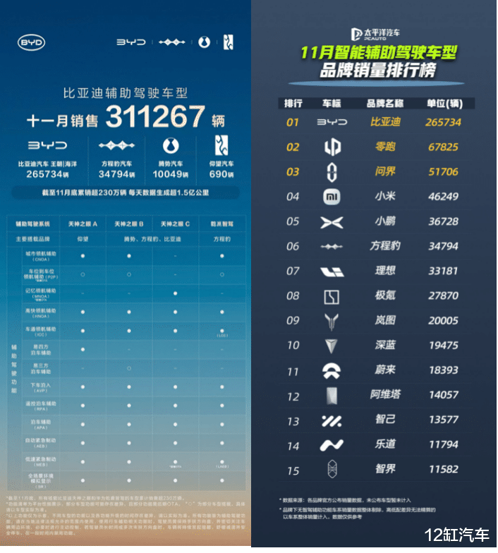 近日,比亚迪公布了其搭载天神之眼辅助驾驶系统的车型在11月的销售数据,全月销量达311267辆,继续引领市场。其中,比亚迪王朝与海洋系列贡献265734辆,方程豹、腾势(参数丨图片)、仰望等高端及个性化品牌亦表现稳健,共同构筑了比亚迪在智能驾驶领域的强大产品矩阵。