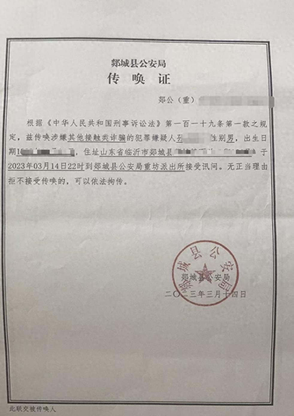 传唤证由郯城县公安局开具,传唤涉嫌其他接触类诈骗的犯罪嫌疑人孙某某于2023年3月14日到该局重坊派出所接受讯问,落款时间为传唤当日。