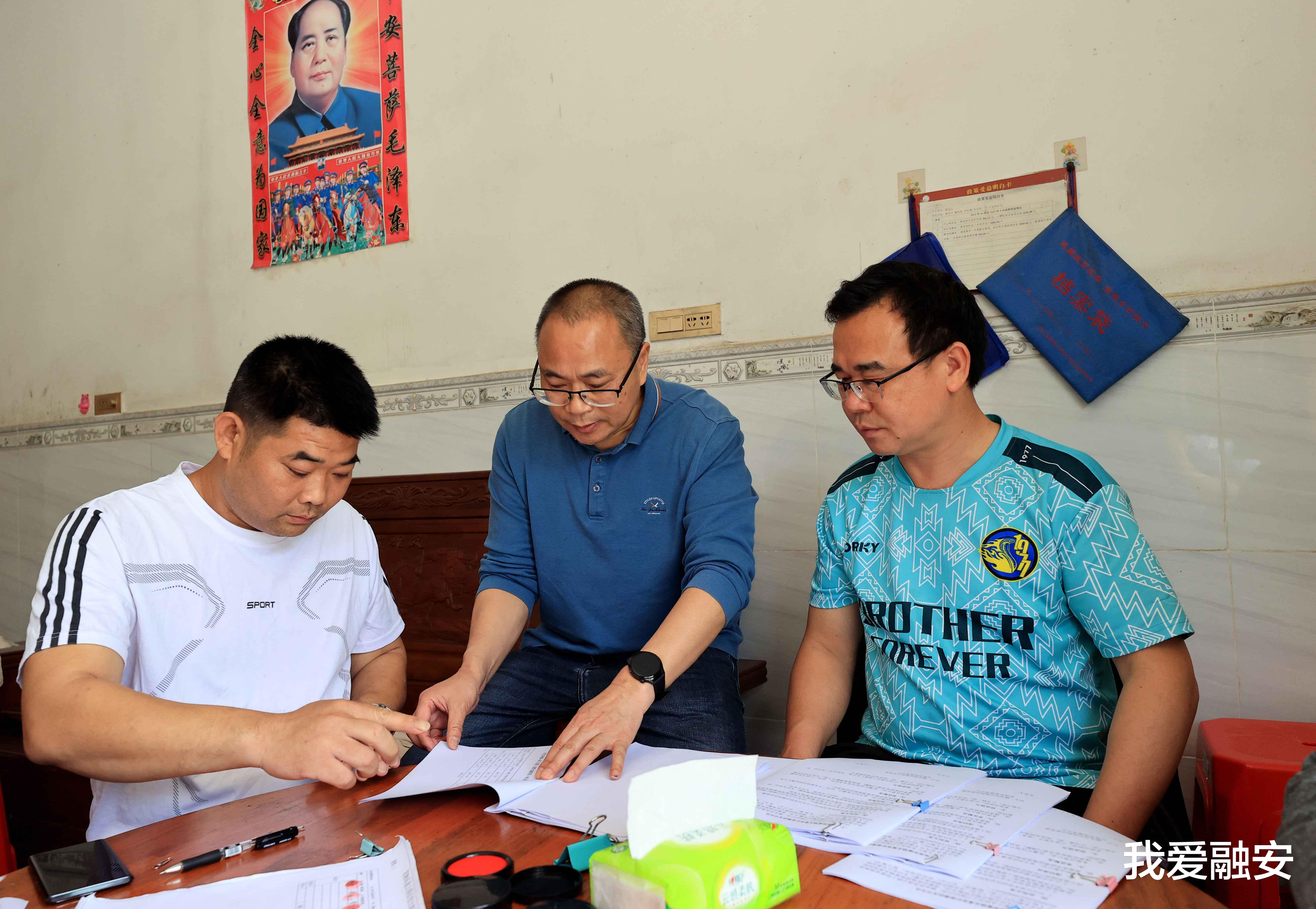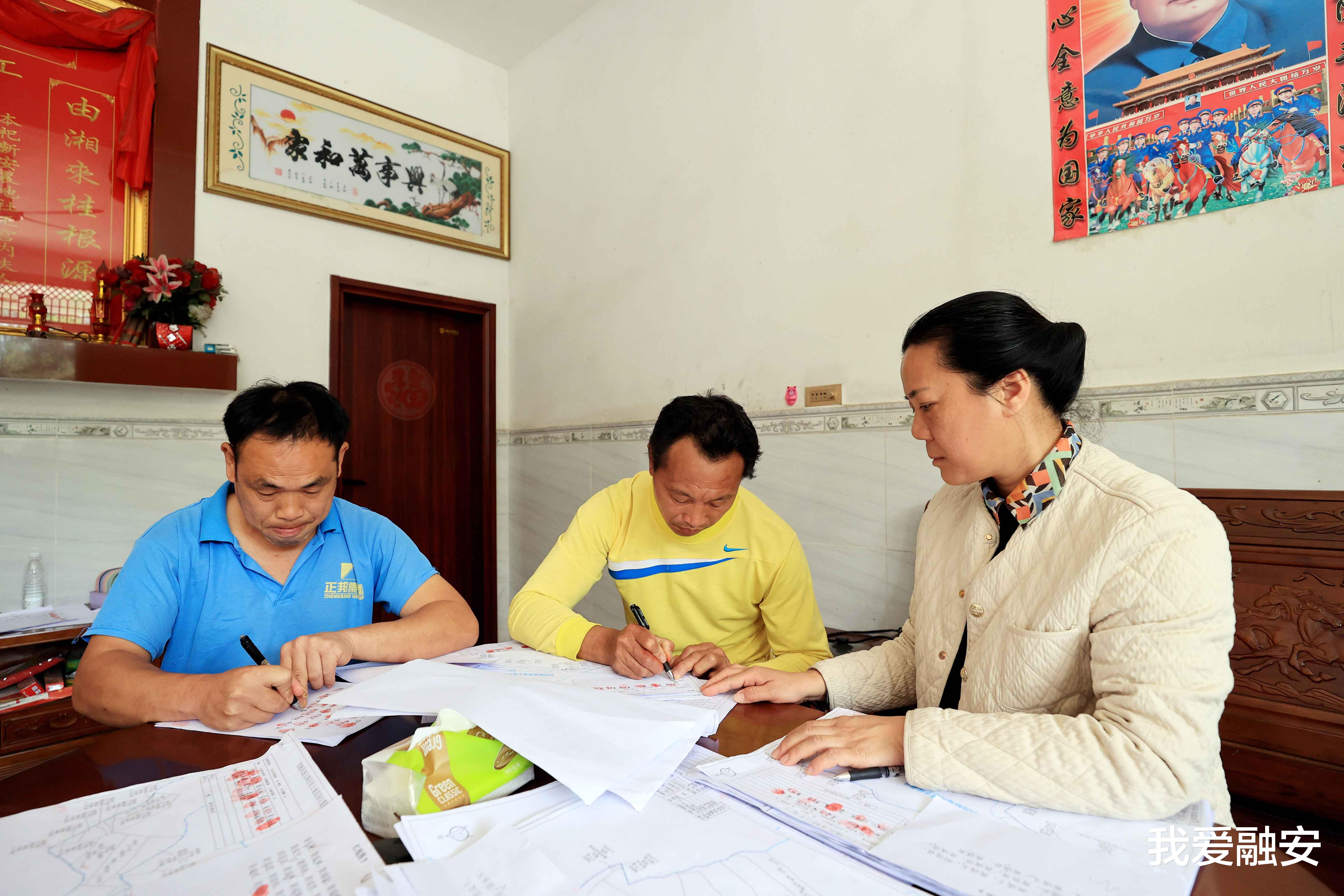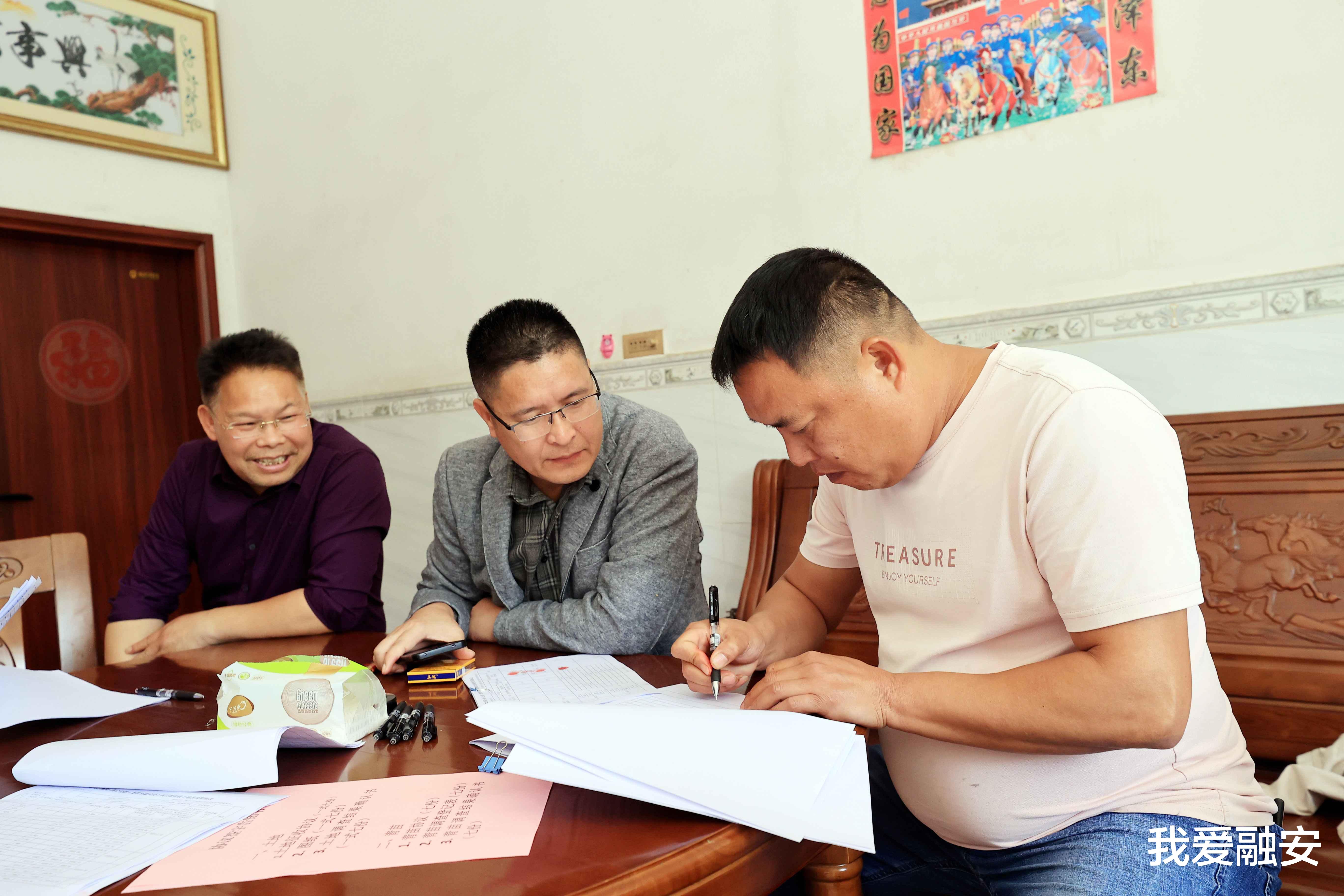 以上图片:4月14日,在广西柳州市融安县浮石镇长龙村三千屯,融安县高速工程建设指挥部办公室工作人员在指导群众签订征地协议。(谭凯兴 摄)