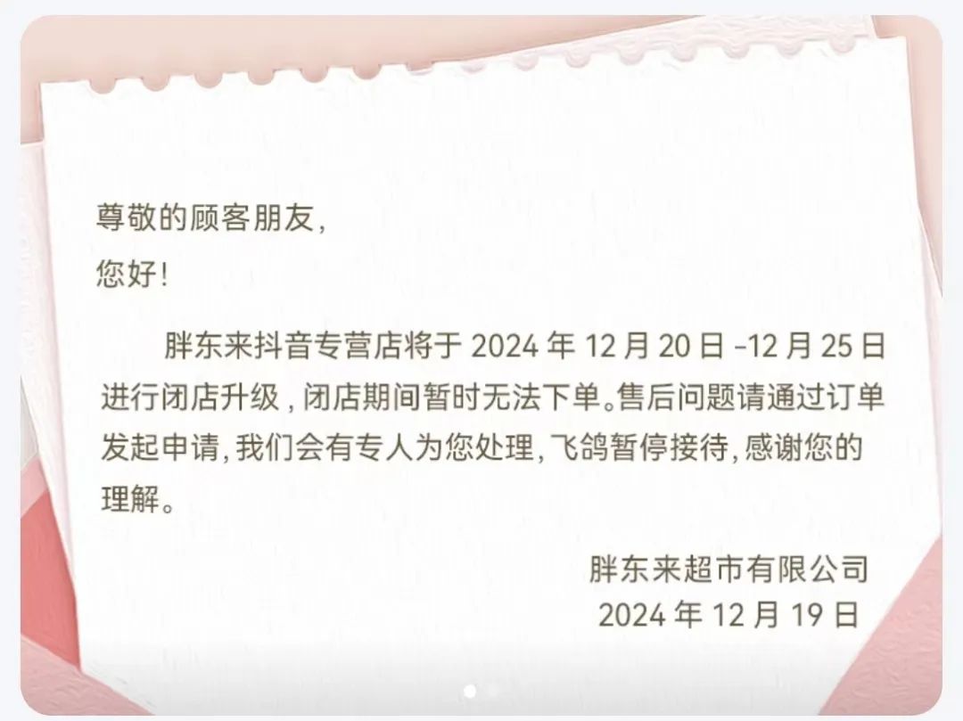 据媒体报道,12月21日,胖东来超市又公告新措施,将部分商品调整为线上销售。