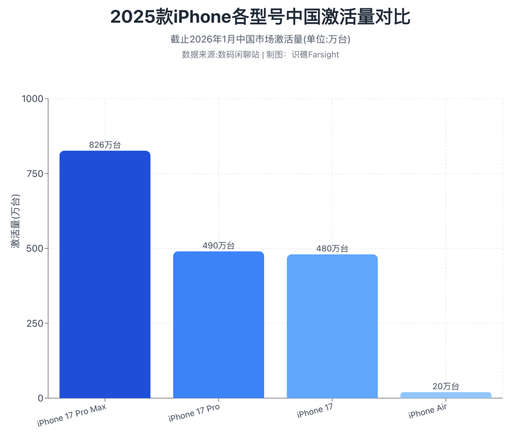 2026年1月24日,“数码闲聊站”爆料称,目前iPhone Air累积激活量不到20万台。对比而言,同期iPhone 17 Pro Max、iPhone 17 Pro以及iPhone 17的激活量分别约为826万台、490万台以及480万台。
