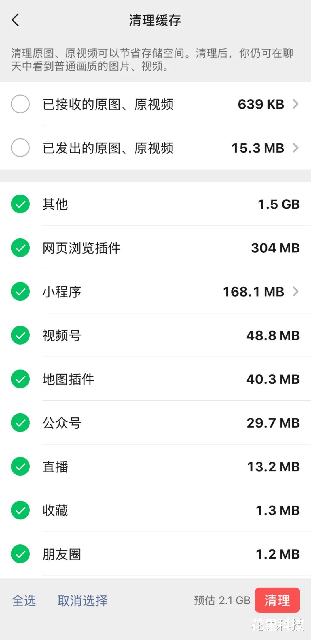 现在微信针对存储已经有了非常完善的管理机制,比如缓存中的清理项目也非常细致,可以详细选择不需要的项目进行清理。