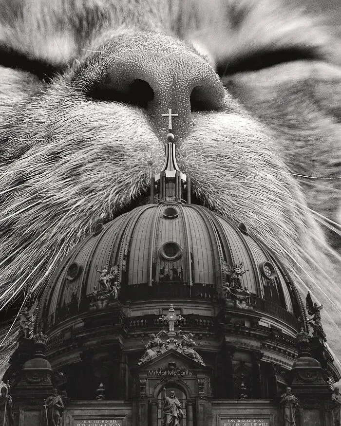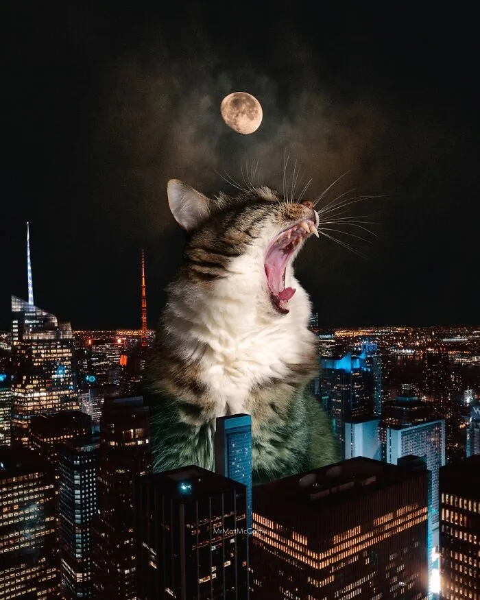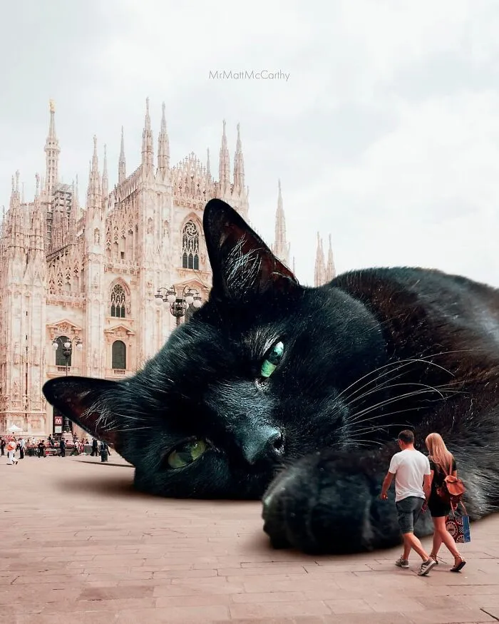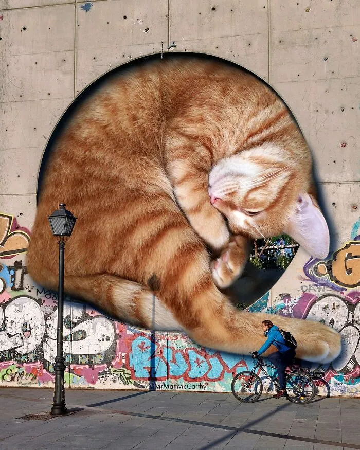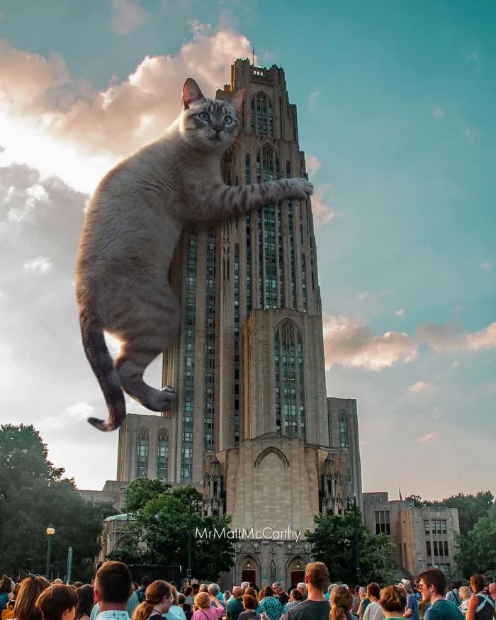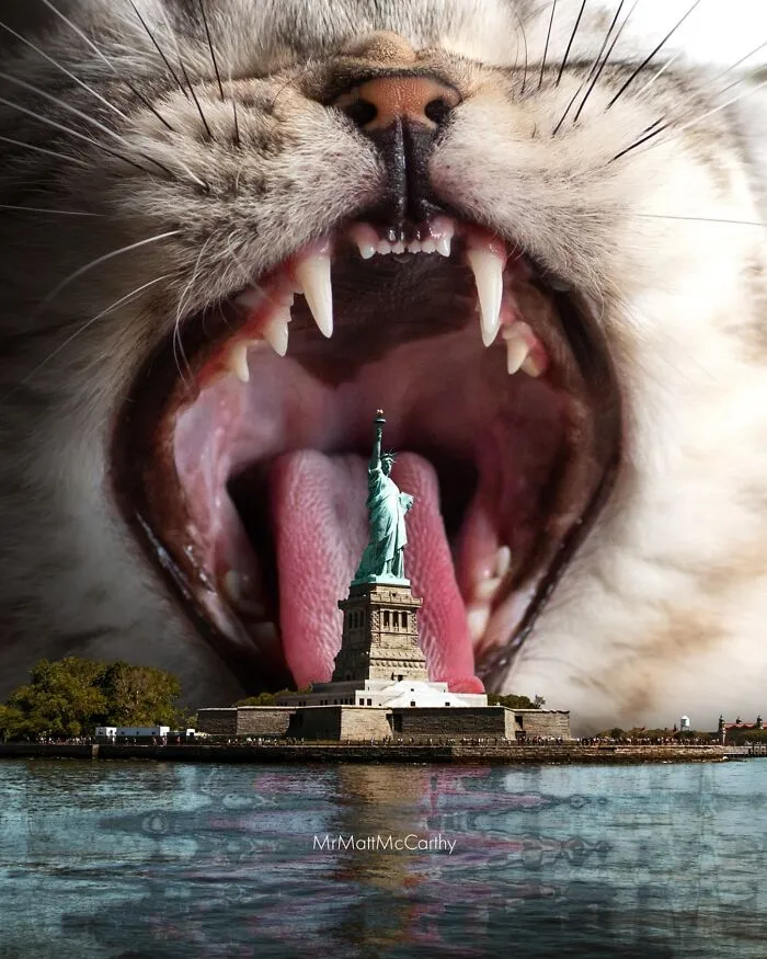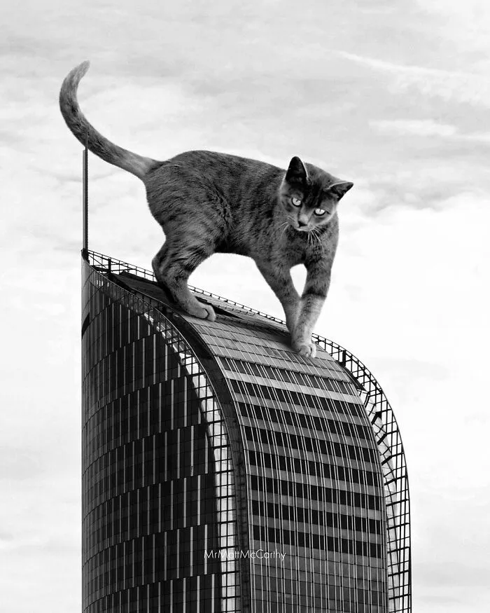 你或许网上看到这样的场景,在北京798撞见过巨型虎斑猫横卧在厂房穹顶,尾巴垂落三十米高空;或是在上海外滩刷到这样的朋友圈:橘猫前爪搭着东方明珠,俯瞰脚下如玩具车般的邮轮。这些令人错愕的魔幻画面,出自美国拼贴艺术家Matt McCarthy之手,他用PS将猫放大500倍扔进现实世界,竟让全球200万网友集体患上“巨物萌化症”