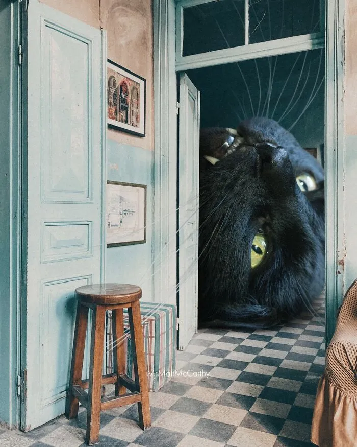 故事要从Matt家那只玩蟑螂的猫说起。某个潮湿的午后,他看着猫咪用肉垫反复拨弄爬虫,突然脑洞炸裂:“如果我们变成蟑螂大小,主子会怎么对待我们?”这个细思极恐的假设,催生出第一幅巨猫拼贴——画面里人类缩成指甲盖大,惊恐地望着如山岳般的猫爪落下