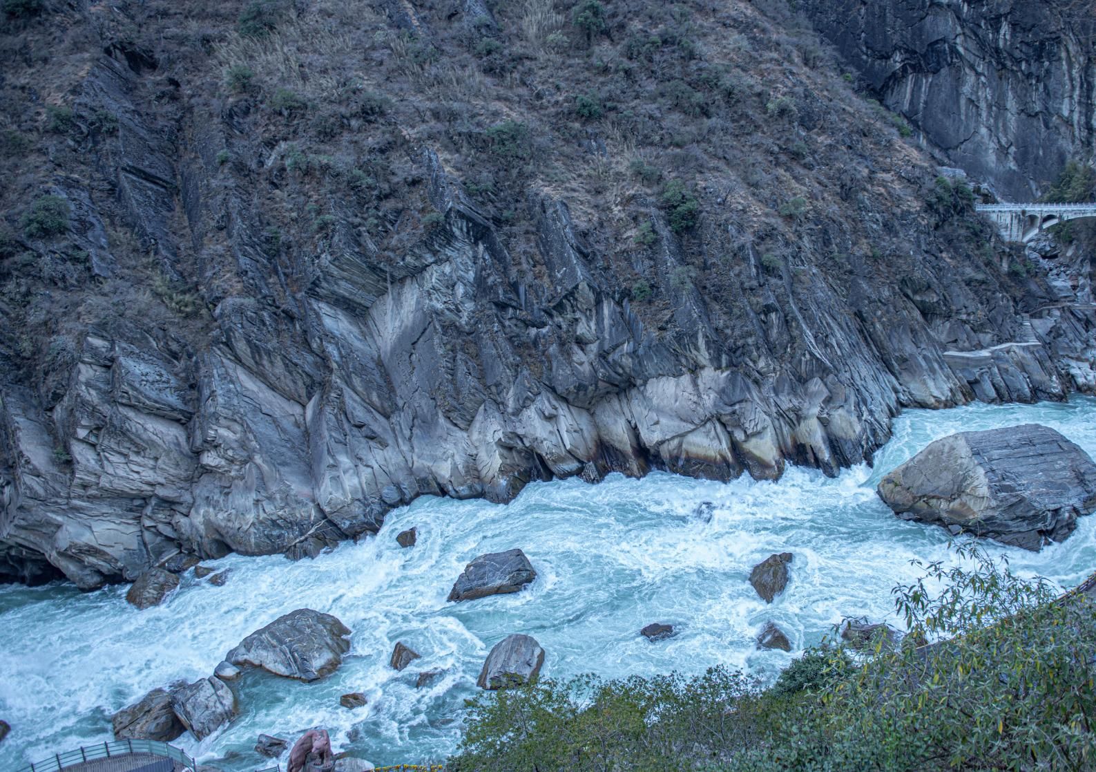 ●虎跳峡的徒步路线多在山壁上,外侧临近悬崖,雨天路面滑,要特别注意防止滑落和落石;中虎跳峡下至谷底的梯道非常陡峭,需格外小心。