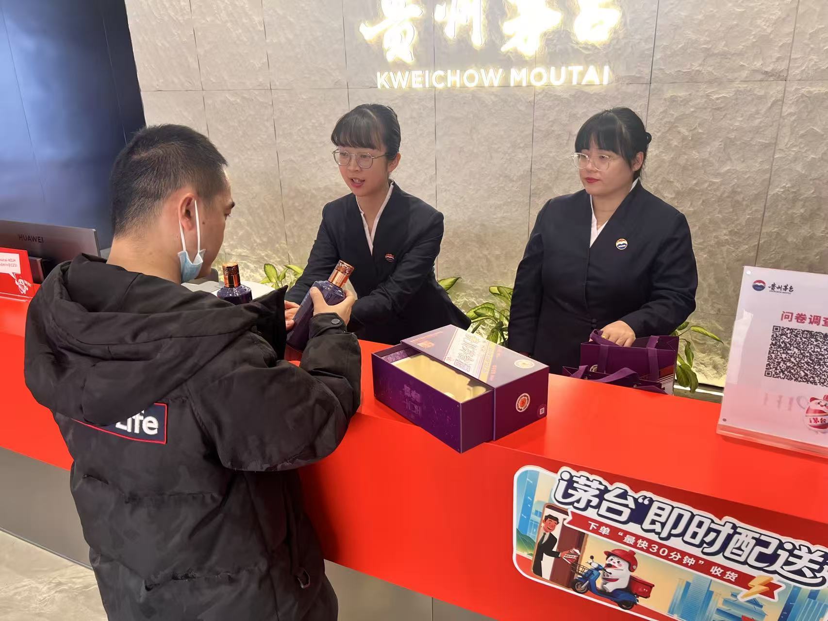 贵州茅台专卖店中林大厦店负责人许荣驰也有同样的感受,“随着‘i茅台’开放更多产品上线,带来更多顾客进店取酒。高峰时,选择我们门店的线上取酒用户一天能有三四十位,是之前‘i茅台’到店顾客数的三四倍。”