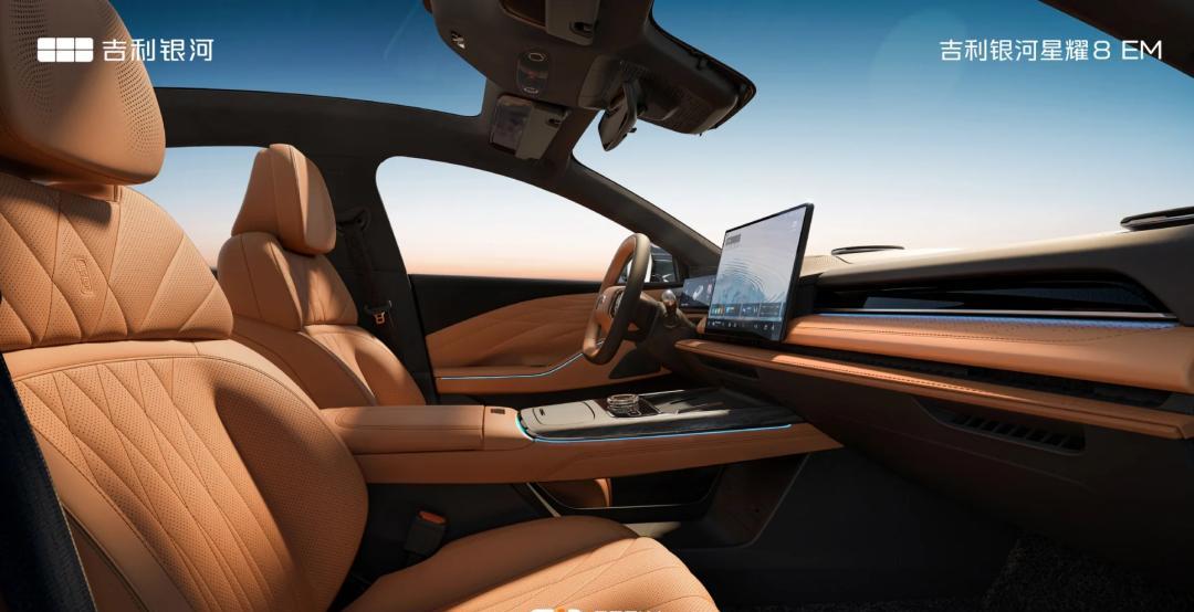 再看看内饰,星耀8 EM也下了不少功夫。大尺寸中控屏、AR-HUD抬头显示、Flyme Auto车机系统,这些配置都紧跟潮流,营造出满满的科技感。双拼色内饰、怀挡设计,也提升了车内的豪华氛围。总的来说,星耀8 EM的内饰在同级别车型中算是比较出色的,至少不会让人觉得落伍。