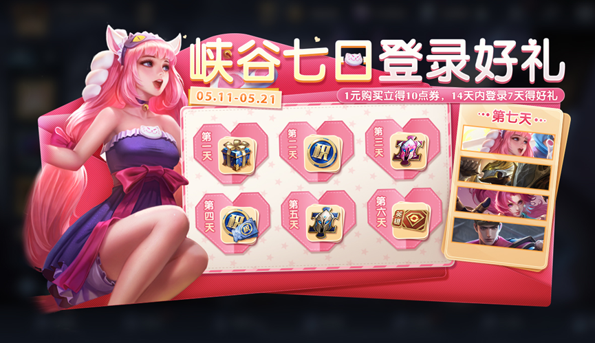 1元福利活动将在5月11日再次回归,花费1元得10点券,累计登录七天抽永久史诗皮肤、荣耀积分等。