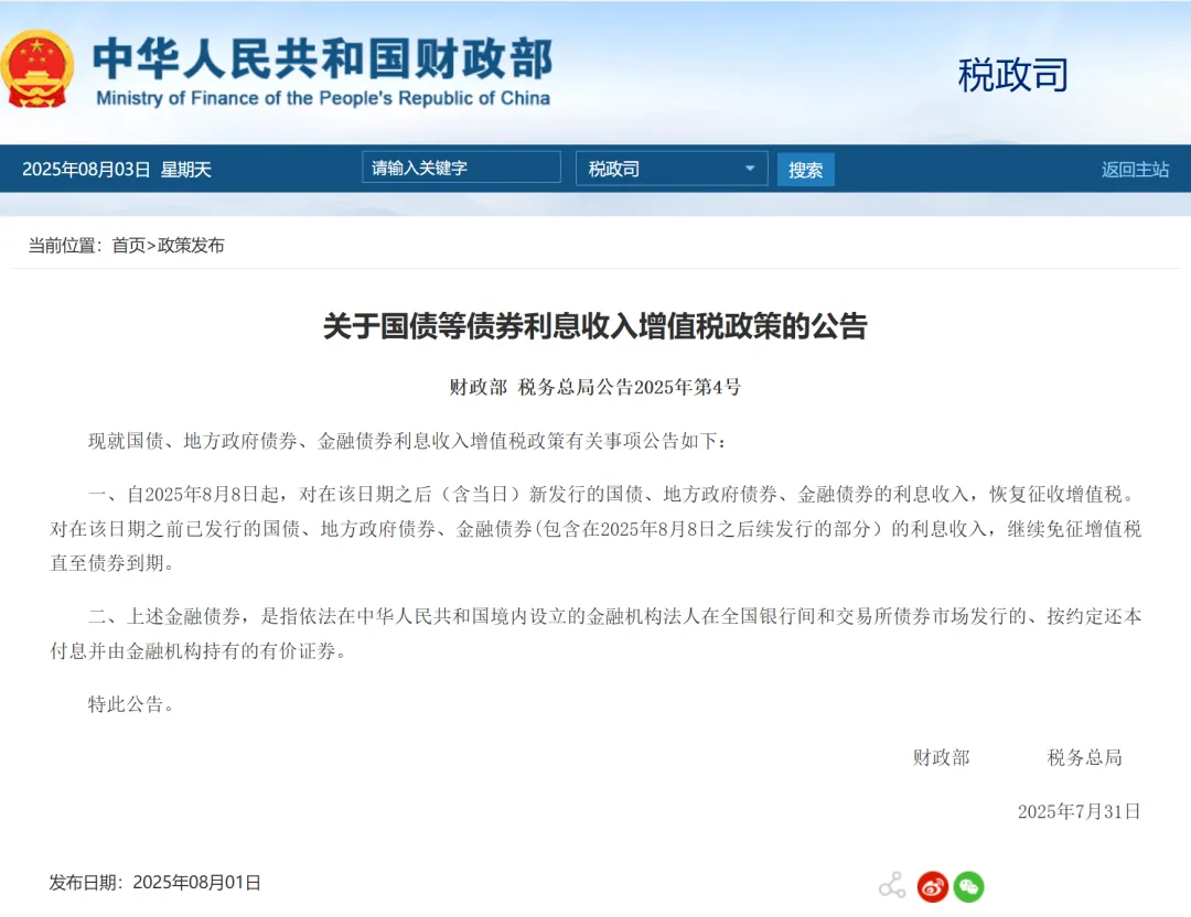 财政部和税务总局联合发文:从8月8日起, 新发行的国债、地方政府债券和金融债券的利息收入,将恢复征收增值税。