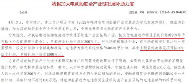 重压之下,政策扶持的东风迅速吹来。福建、广东、山东、上海等地相继出台电动船补贴政策,其中福建更是 “下血本”,对卖方拓展外省市场,按动力系统交付价格的 20% 给予补助;对船东企业,也就是买方,直接补贴 40%,若是省级首批次示范项目,补贴更是高达 60%。