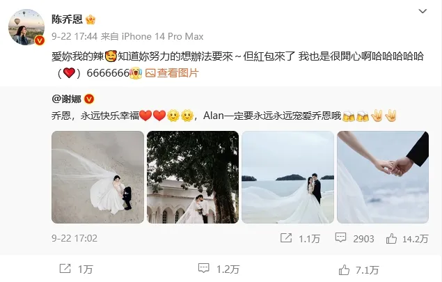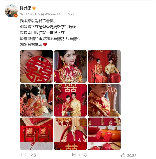 9月22日,陈乔恩与艾伦回到了两人爱情的起点,在定情地马来西亚兰卡威举办婚礼。陈乔恩一袭洁白的婚纱,挽着艾伦的手臂,脸上洋溢着幸福的笑容。