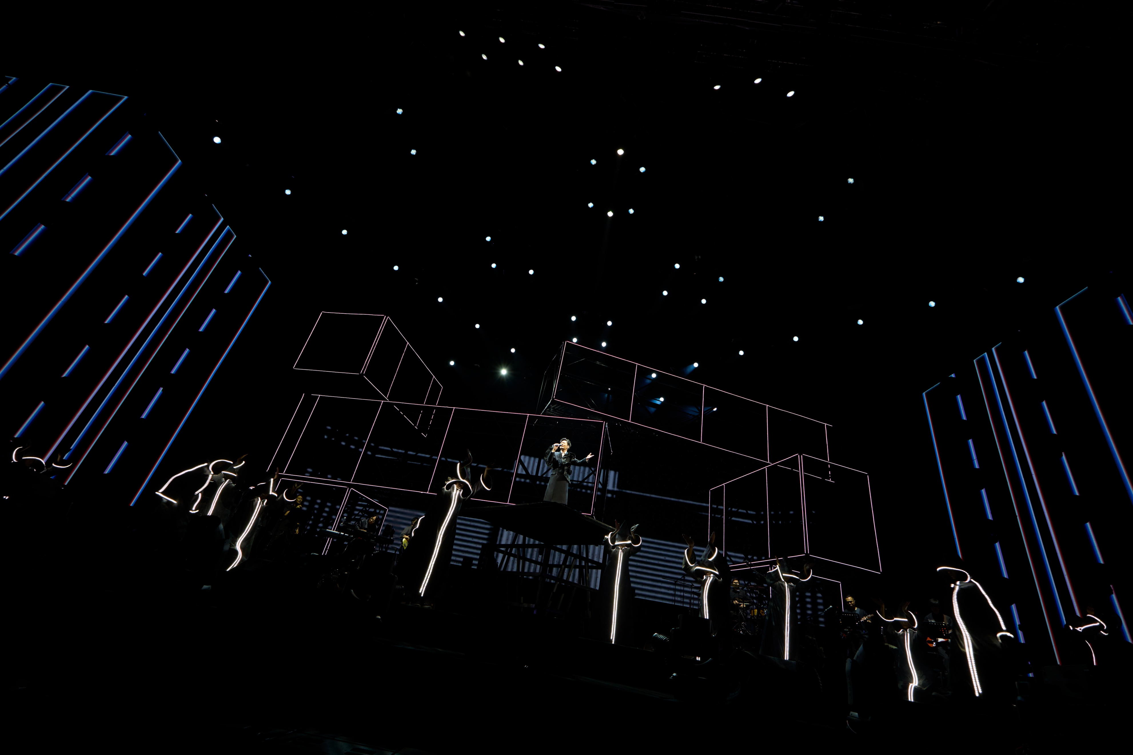 除了选曲用心,未来式2.0舞台上呈现了许多与艺术家合作的视觉作品。演唱歌曲《时间都去哪儿了》时,主屏幕上出现张信哲与德国艺术家合作创作的艺术作品——《时间》。作品用张信哲的脸做成了3D建模影像,通过随着时间生成皱纹,呈现岁月流逝。张信哲现场调侃自己“如果我的脸皱成一团的时候来开演唱会,你们会接受吗”,引得歌迷热烈表白,高呼“喜欢”、“会来”。