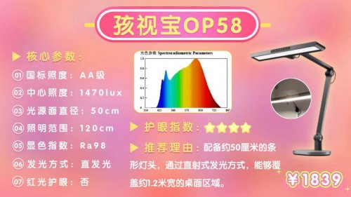 9.孩视宝OP58(推荐指数:⭐⭐⭐⭐)核心亮点:配备约50厘米的条形灯头,通过直射式发光方式,能够覆盖约1.2米宽的桌面区域。