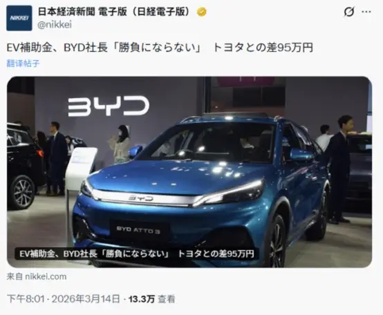 近日,日本经济产业省宣布上调电动汽车补贴上限,最高补助金从90万日元(约合人民币3.92万元)提升至130万日元(约合人民币5.67万元)。日本政府声称此举意在推动本国绿色出行转型,然而政策落地后,所谓“普惠”却成了“排他”的代名词。从实际执行结果看,真正获得最大红利的,是丰田、日产、铃木、特斯拉等日系与美系品牌。与之形成鲜明对比的是,中国车企比亚迪被区别对待,未能从中受益。以比亚迪旗下元PLUS(ATTO 3)在内的四款纯电车型为例,其补贴没有任何上调,维持在35万至45万日元区间,与日系、美系同级车型高达127万至130万日元的补贴相比,差距最高达到惊人的95万日元(约合人民币4万元),这一悬殊差距正是日本补贴双重标准的最直接的体现。