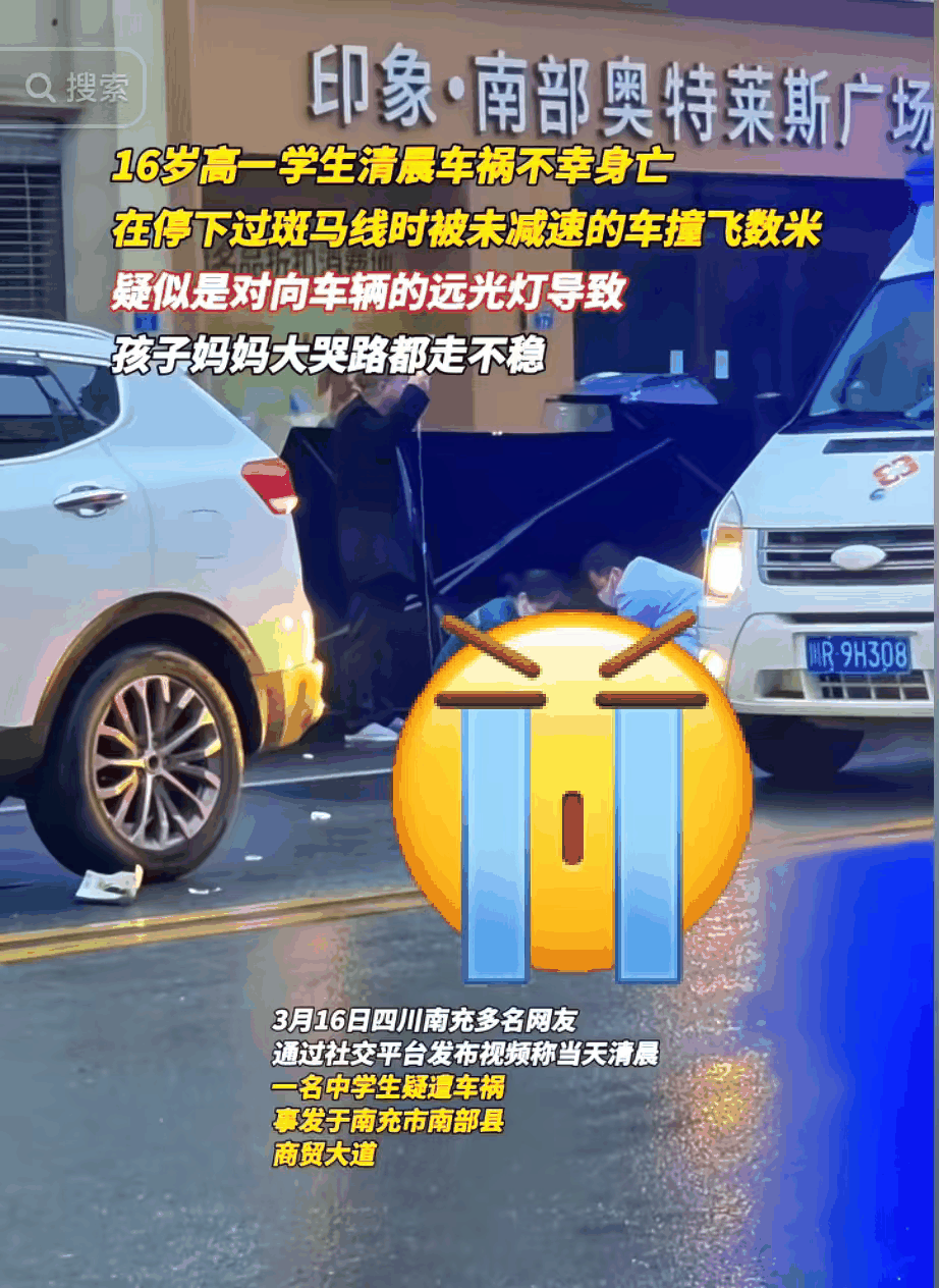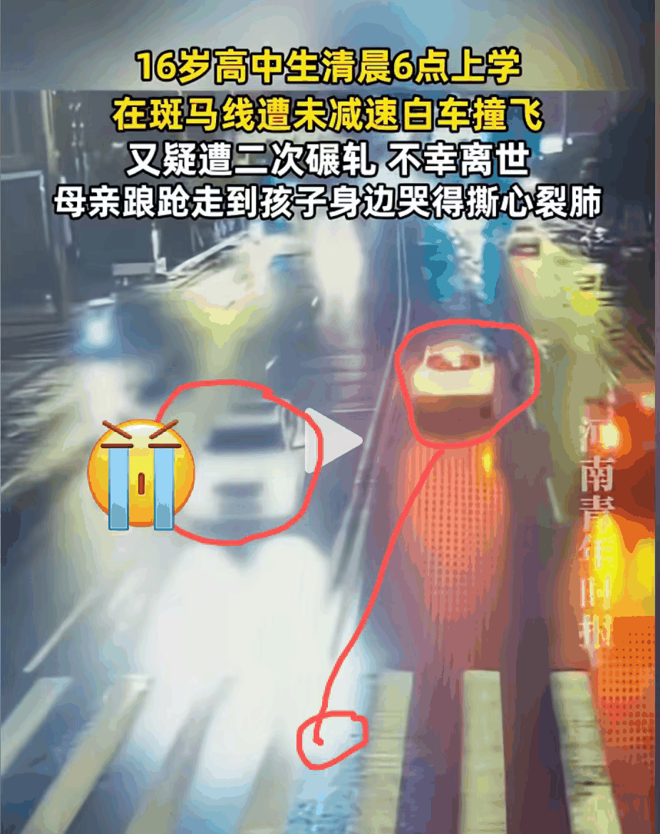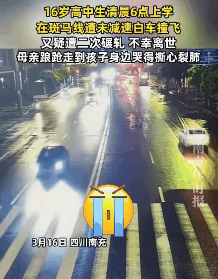 四川南充南部县一名15岁的高中生,于清晨上学途中,在斑马线处被未减速的白色车辆撞飞,随后疑似遭对面车道车辆二次碾轧。其母亲听闻噩耗,脚步踉跄地走到孩子身旁,悲痛欲绝地哭泣。最终,这名高中生不幸离世。