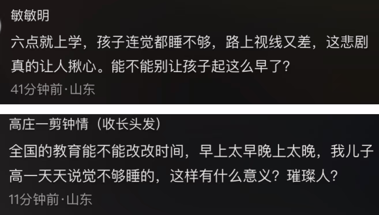 还有家长表示,孩子早上上课太早,晚自习放学太晚,他儿子上高一,整天说睡眠不够,这样做意义何在?实在是折磨人。