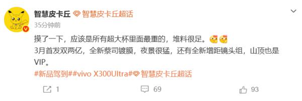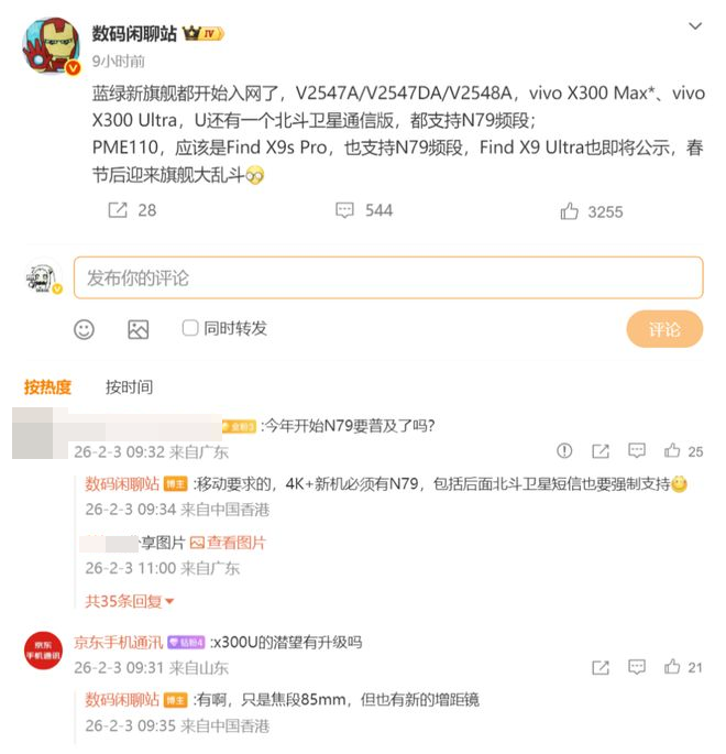 日前,数码博主“蓝绿新旗舰都开始入网了,V2547A/V2547DA/V2548A,vivo X300 Max*、vivo X300 Ultra,U还有一个北斗卫星通信版,都支持N79频段;PME110,应该是Find X9s Pro,也支持N79频段,Find X9 Ultra也即将公示,春节后迎来旗舰大乱斗”。另外,包括数码博主“智慧皮卡丘”在内的多位数码博主也曝光了疑似vivo X300 Ultra的重量和影像配置信息。