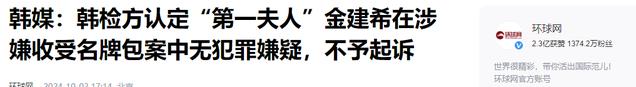 【1】环球网2024-10-02《韩媒:韩检方认定“第一夫人”金建希在涉嫌收受名牌包案中无犯罪嫌疑,不予起诉》