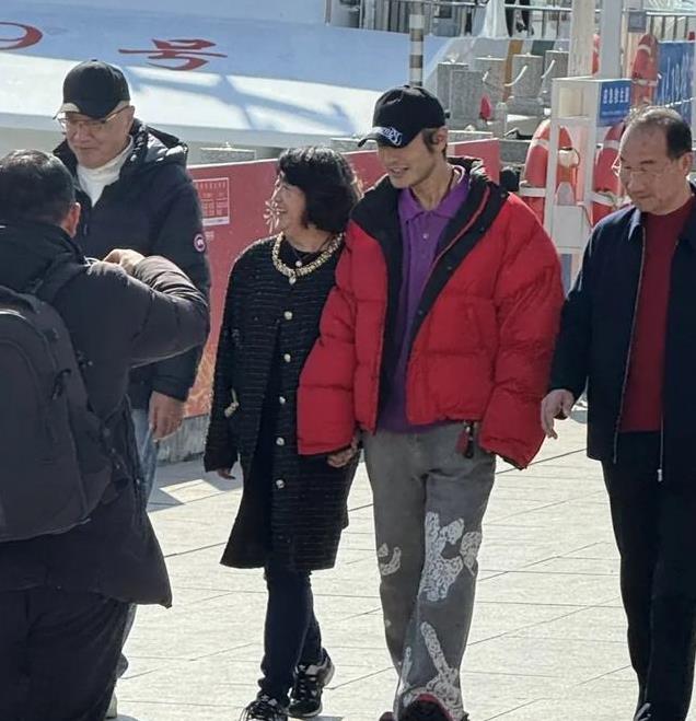 一直在外抗事业的黄晓明,此刻也卸下“丈夫”、“父亲”的担子,变回了“儿子”,他穿着大红羽绒服、印花牛仔裤,打扮喜庆又年轻,他拉着妈妈的手,走路一顿一顿,完全还是被宠着的独生子模样。