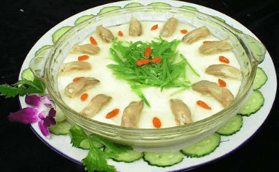 主料: 鸭舌 100克辅料: 鸡蛋清 100克 、玉兰片 3克、 胡萝卜 2克 、油菜心 2克调料: 猪油(炼制) 10克、 盐 2克 、味精 1克、 黄酒 5克 、花椒 1克、 鸡油 3克 、大葱 5克 、姜 5克 、淀粉(玉米) 3克 各适量做法1. 将鸭舌煮熟刮去硬皮,取出舌内硬骨,保持形状完整;2. 油菜心洗净放入开水内焯熟,捞出沥水切薄片;3. 玉兰片、胡萝卜切成薄片;4. 淀粉放碗内加水调出湿淀粉;5. 花椒放入碗内泡出花椒水备用;6. 将鸡蛋清放入汤盘内,加入精盐、味精、黄酒、花椒水、鸡汤100克,用筷子搅匀,上屉蒸5分钟取出,即成为芙蓉底;7. 勺内放入油烧热,放入葱、姜块炸出香气来;8. 去掉葱、姜块,添上鸡汤,取将鸭舌、玉兰片、油菜、胡萝卜放入勺内,烧开打净浮沫,用湿淀粉勾芡,淋上鸡油,浇在芙蓉底上即成。酸菜鸭舌