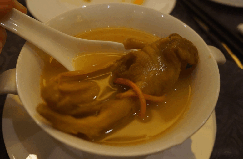主料:鸭掌8只,鸭舌24个。配料:虫草10克,枸杞5克,葱2根,姜2片。调料:酒3大匙,盐1克,高汤1碗。制法(1)将鸭掌、鸭舌洗净,放入锅内,加姜、酒、水淹过,入笼蒸20分钟,取出用冷水冲凉后,去骨并洗净,沥干水分装盘。(2)虫草、枸杞分别泡开、洗净,加高汤1碗,入笼蒸约20分钟取出。卤鸭舌