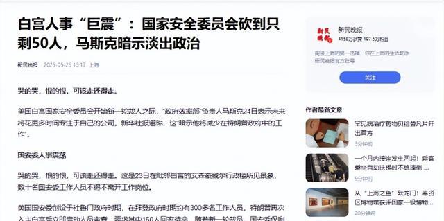 白宫人事“巨震”:国家安全委员会砍到只剩50人,马斯克暗示淡出政治.新民晚报.2025-05-26