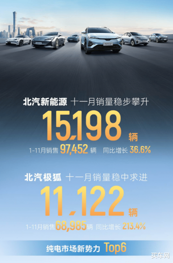 特斯拉作为曾经的领头羊,近期销量明显下滑,10月销量降幅超40%。与此同时,自主品牌新能源汽车表现强劲,市场份额增长至77%。在自主品牌中,北汽极狐的增速尤为显著。从2月的销量不足千辆,到6月突破八千,再到8月起连续破万, 11月,极狐稳中求进,销量11122辆,位居纯电市场新势力TOP6。