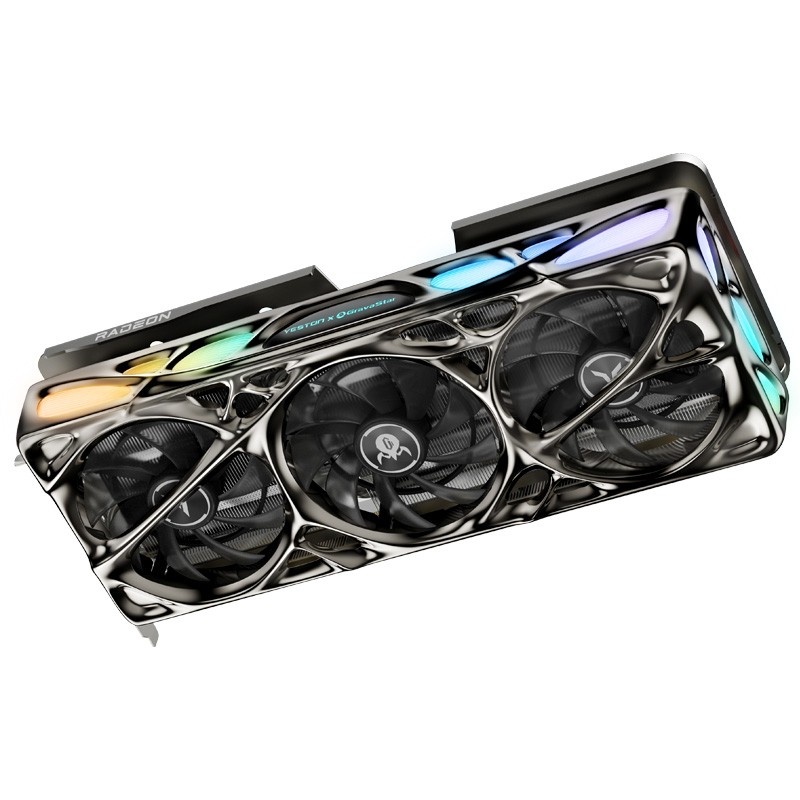 这是盈通和重力星球联名打造的产品,外观采用了生化金属风,个性指数拉满。侧面和顶部都设置了鹅卵石形状的RGB灯,让显卡看上去更加的炫酷。盈通RX 9070 XT 16G破茧 OC配备了13+3相供电,核心最高频率达到了3060MHz,具备不错的性能输出。