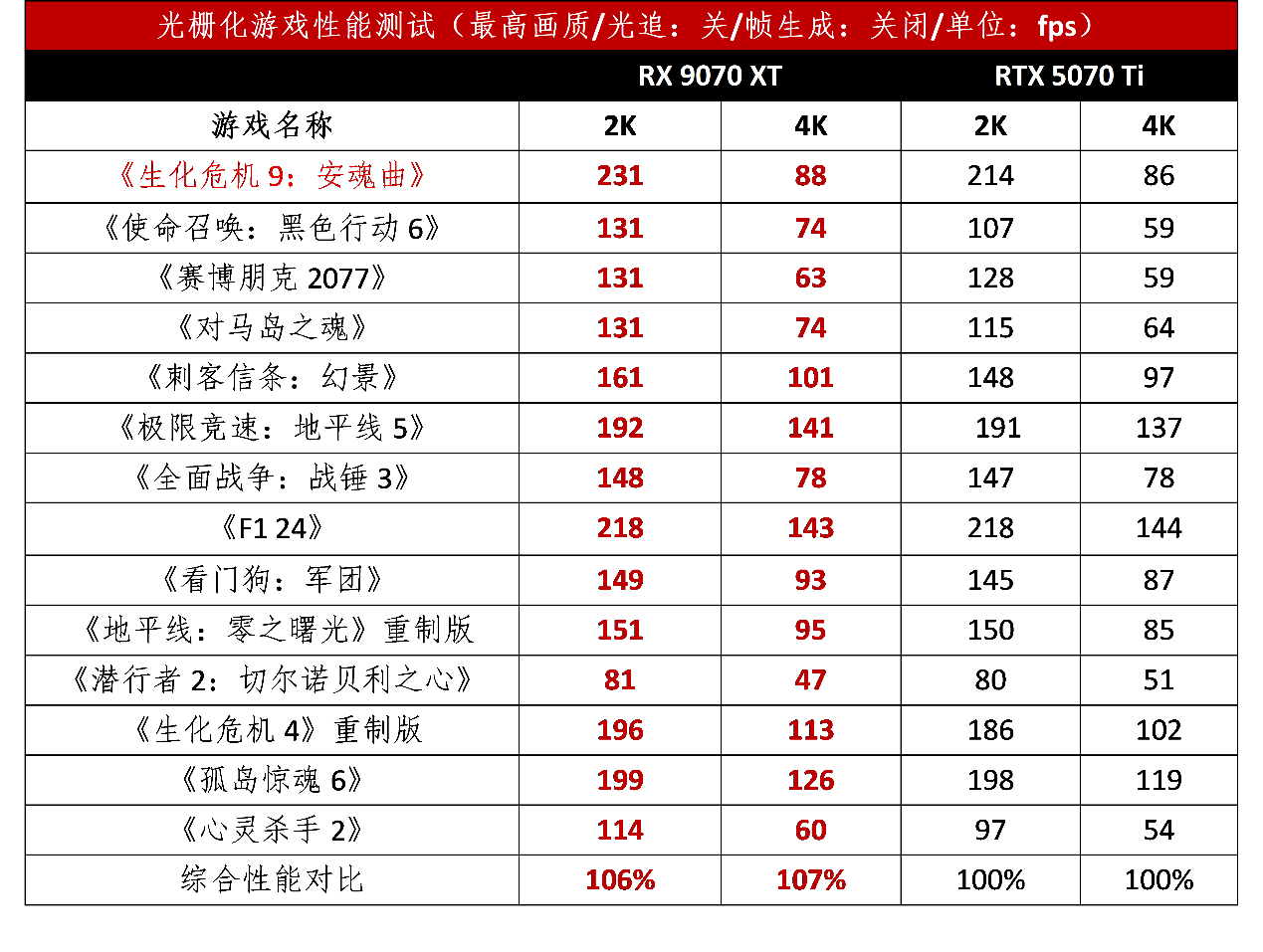 与RX 9070 XT定位相同的是RTX 5070 Ti。在最能体现显卡“硬实力”的光栅化游戏中,RX 9070 XT最大领先幅度达到了22%,4K和2K分辨率下RX 9070 XT综合下来平均领先的幅度大约为6%和7%,性能优势还是非常明显。考虑到两者价格相差2000元,可见这个性价比已经超越对手一两个档次了。