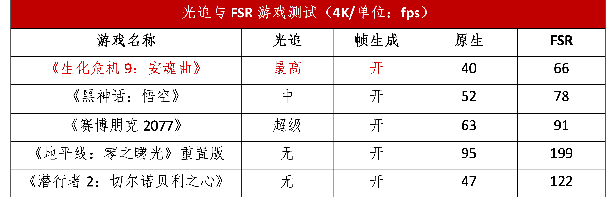 在4K分辨率下还要开启光追,对显卡的压力是非常大的。在开启了FSR与帧生成之后,游戏帧率均出现了比较大幅度的提升。特别是《生化危机9:安魂曲》《黑神话:悟空》《潜行者2:切尔诺贝利之心》的画面平均帧率都提升到了60fps的流畅帧率以上,游戏体验改进明显。
