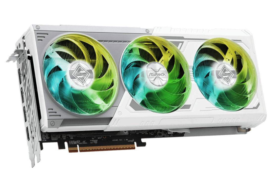 这是目前售价较为便宜的一款RX 9070 XT,不过在做工用料上并未有明显缩水。显卡采用了银白色外观,是钢铁传奇的经典配色,适合白色主题装机。华擎RX 9070 XT 16G钢铁传奇也具备了不错的RGB灯效,支持Polychrome SYNC,可与华擎主板同步灯效,打造出个人专属效果。