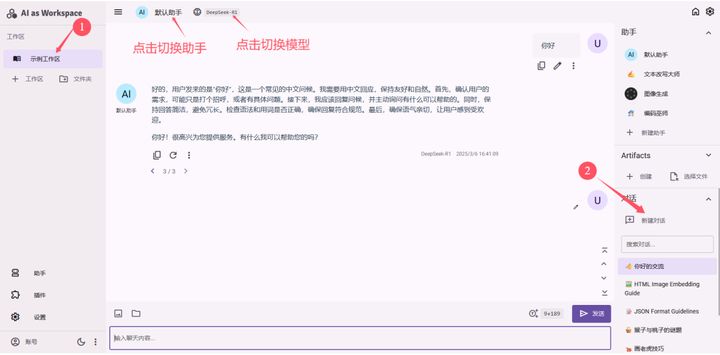 然后点击工作区,在右侧“新建对话”,就可以开始进行聊天和对话了,在上方可以切换模型和上百种聊天助手。